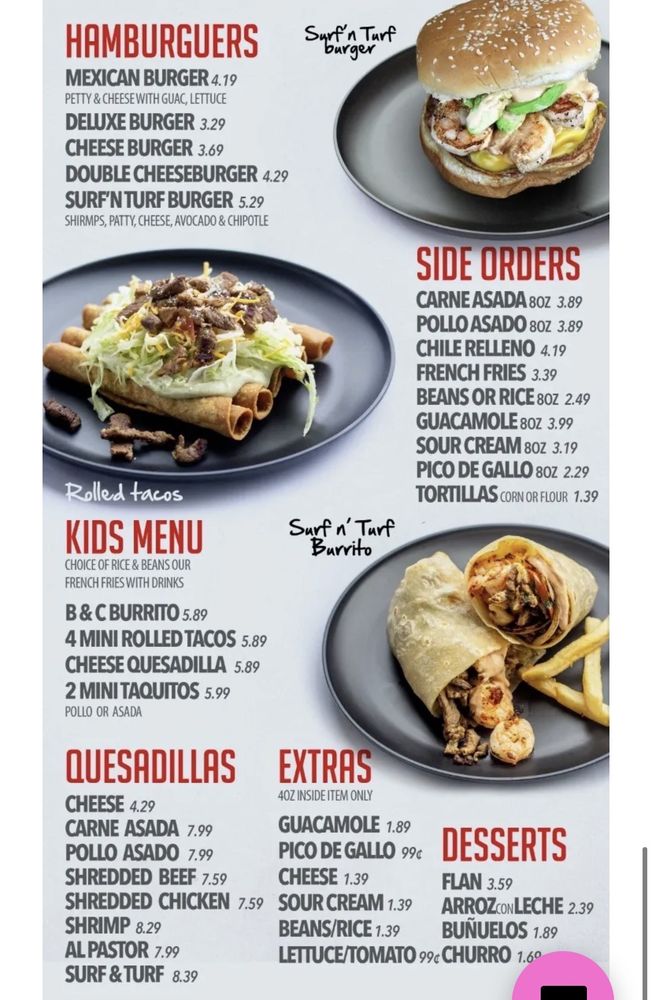 Shrimp, beef patty, cheese, avocado Slices and chipotle Crema